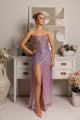 This floor-length gown glows in soft lilac and blush-pink sequins, flowing effortlessly from a sculpted corset bodice to a dramatic A-line skirt. The structured top defines your shape with flattering precision, while the detachable back train adds a couture-level wow factor perfect for your grand entrance.